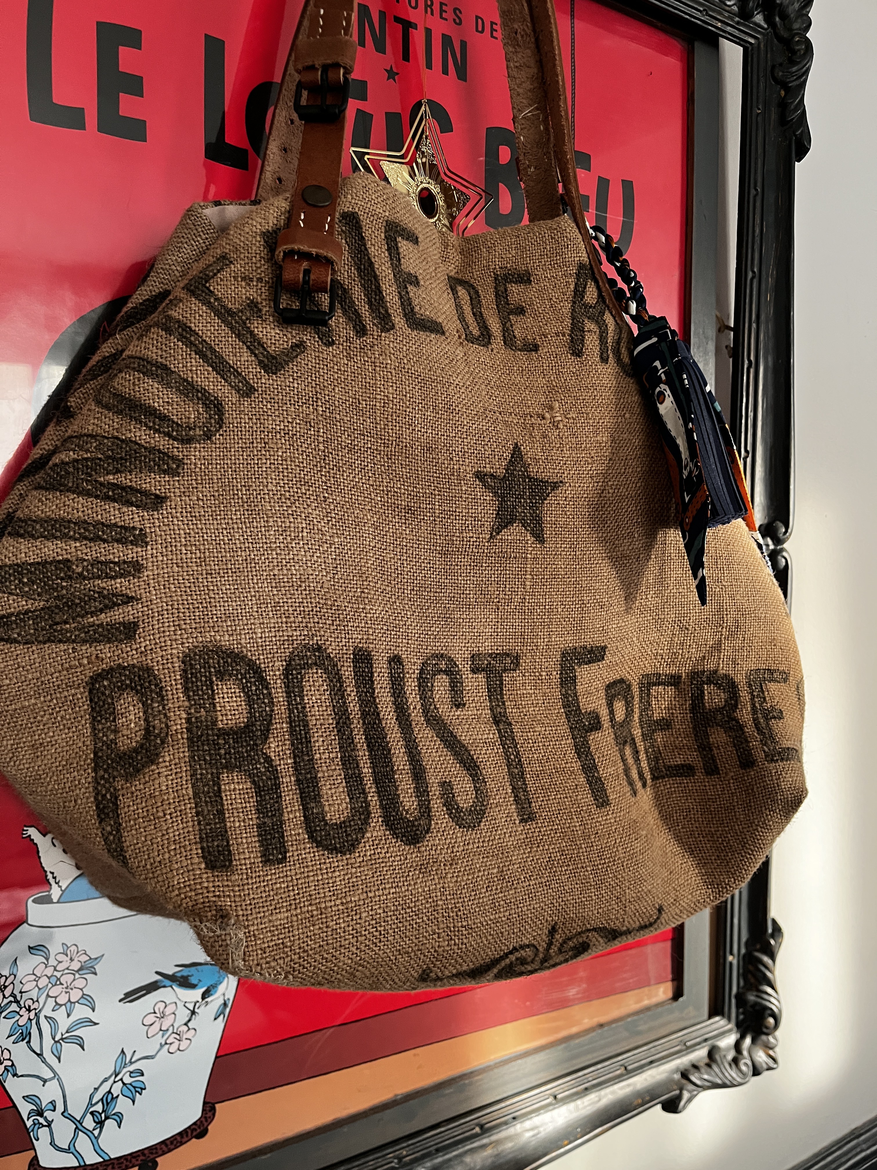 Ce cabas moyen modèle a été créé - à partir d'une ancienne toile de jute de transport de presse des années 1970 de la Société "Nouvelles Messageries de la Presse Parisienne" fondée. en 1947 et chargée de distribuer la presse dans les centres de diffusion